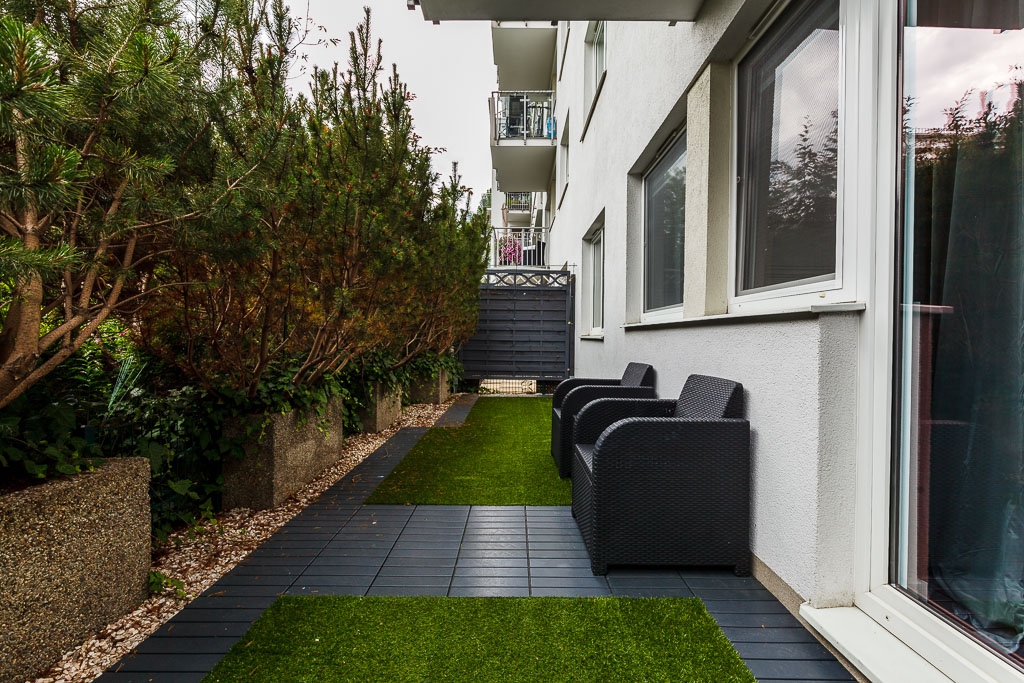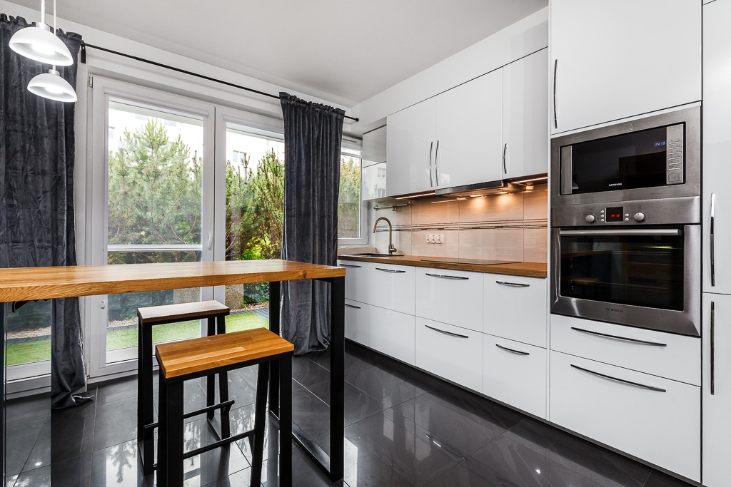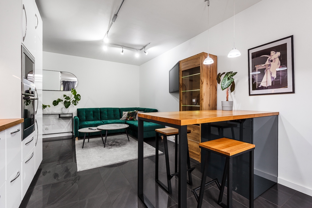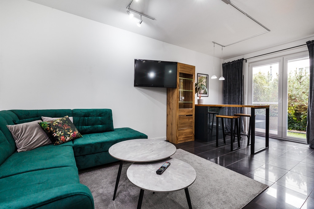 - Salon z aneksem kuchennym z wyjściem na ogródek