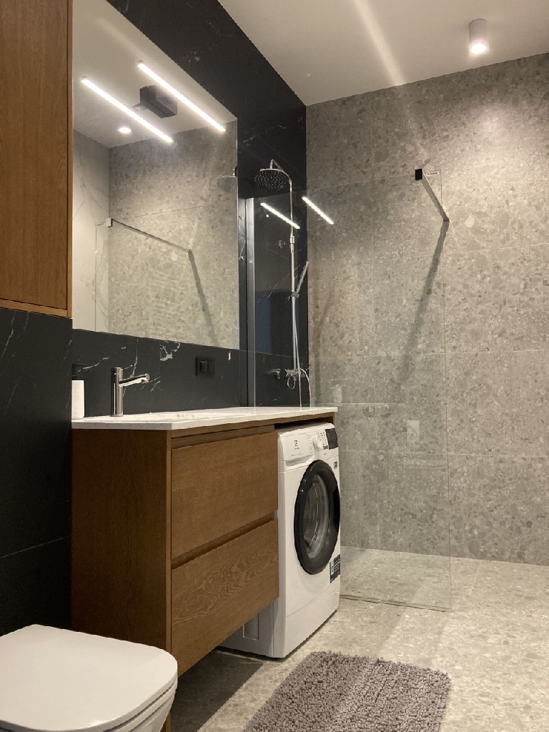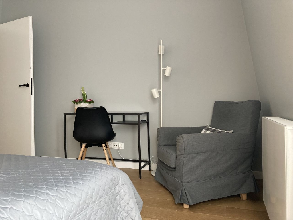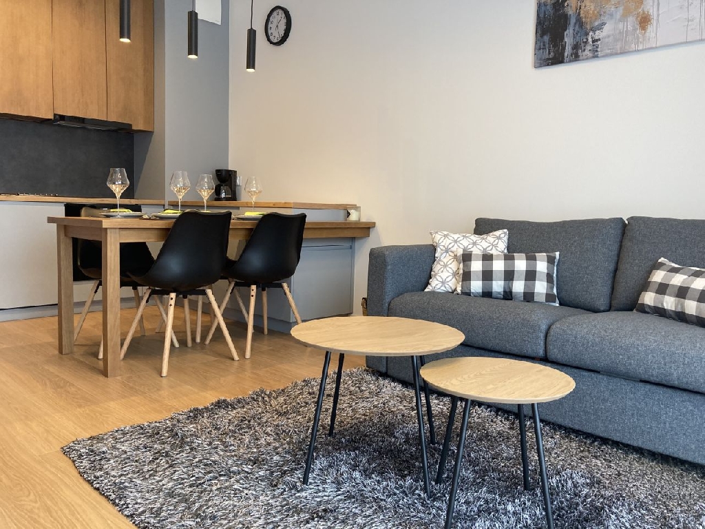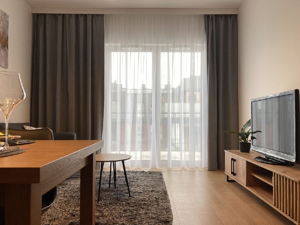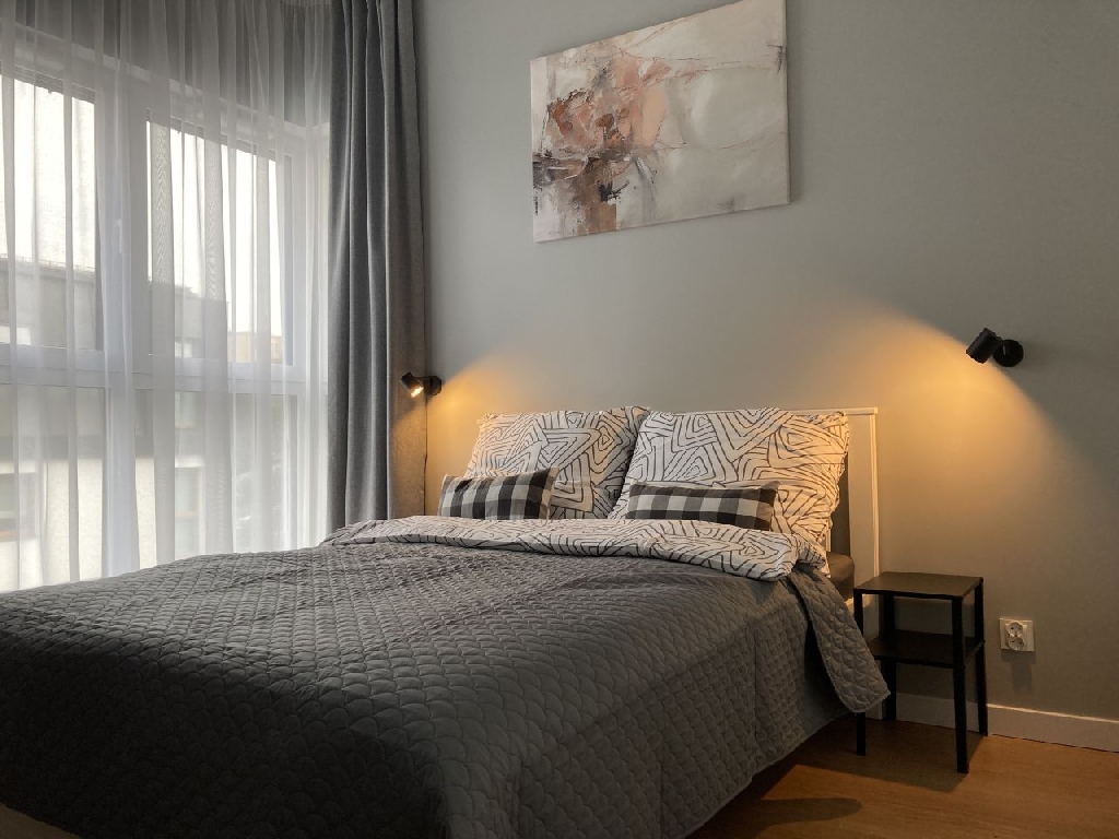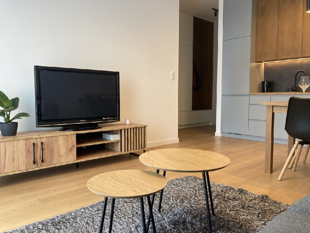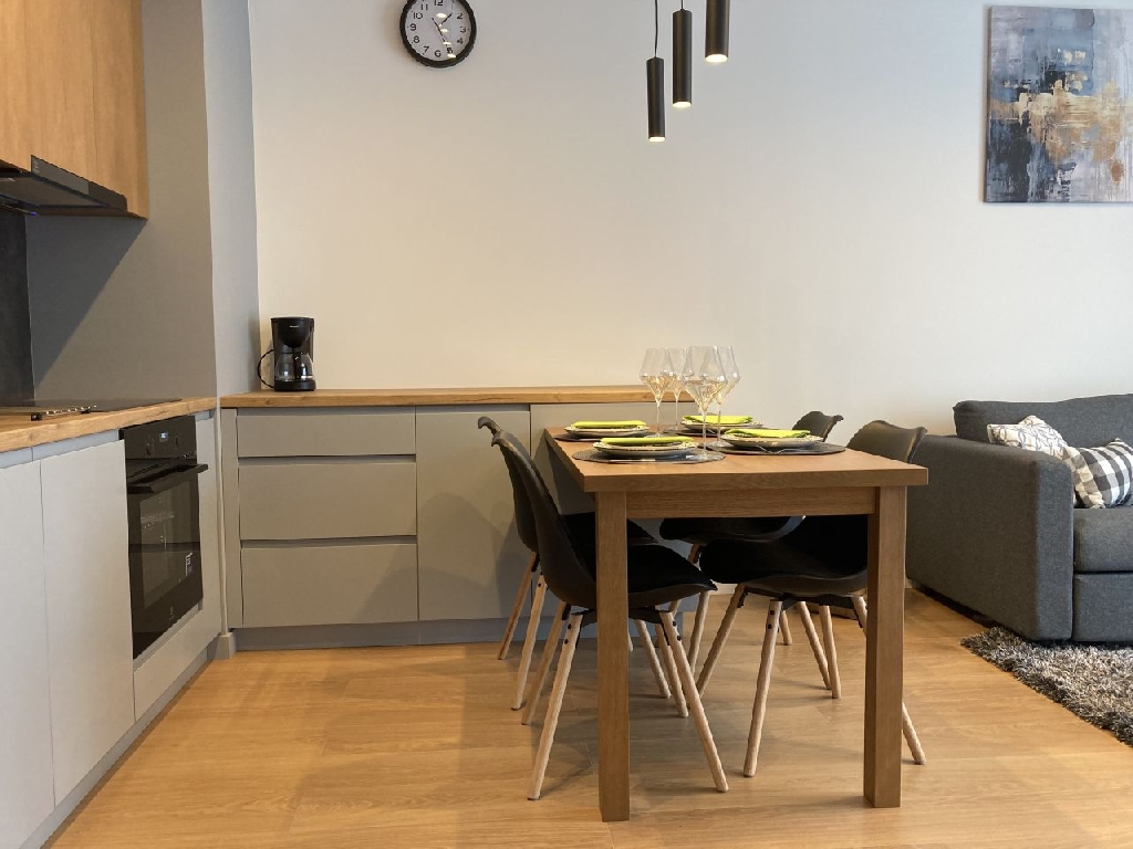 Mieszkanie znajduje się na 4 piętrze i składa się z salonu z aneksem kuchennym, sypialni, łazienki z prysznicem oraz przedpokoju. Z salonu wyjście na balkon. Mieszkanie jest w pełni umeblowane i wyposażone (m.in. lodówko-zamrażarka, piekarnik, zmywarka, płyta indykcyjna, okap). W salonie rozkładana sofa, stół z krzesłami, szafka RTV, telewizor. W sypialni duże łóżko małżeńskie, szafa wnękowa i biurko do pracy. W łazience prysznic typu walk-in oraz pralka. W przedpokoju szafa w zabudowie.